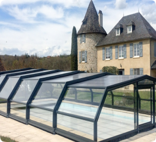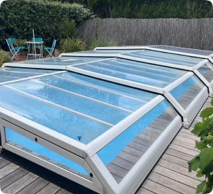 L’architecture même de L’Abri (voûte à pans coupés) a permis d’obtenir une ligne fluide et lisse, sans aucune vis apparente, pour un abri de piscine élégant, qui s’intègre parfaitement à son environnement. L’Abri est particulièrement bas, et libère intégralement la plage de votre piscine.